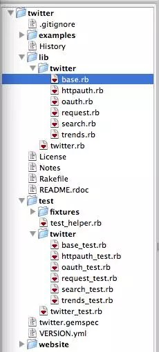 首先注意文件结构。这一步可以使用一个有文件夹层次结构视图的编辑器(如 TextMate),比如,这是一个很好的 Twitter Ruby gem 总览。